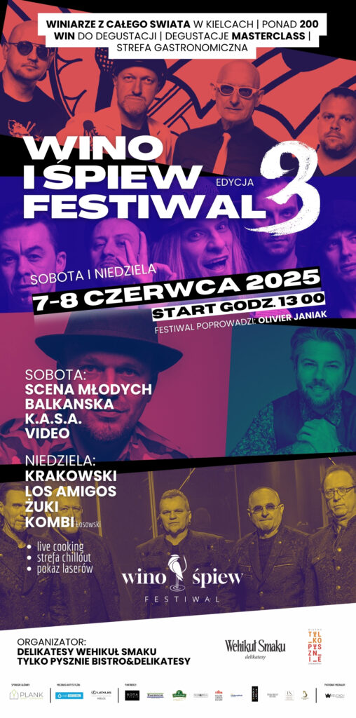 Wino i Śpiew Festiwal 2024 -Dwa dni niezapomnianej imprezy! Pierwszy dzień Wino i Śpiew Festiwal obfitował w liczne atrakcje. W strefie degustacyjnej uczestnicy mieli okazję spróbować wyjątkowych win od blisko 20 winiarzy z Polski i innych krajów Europy. Strefa gastronomiczna serwowała dania kuchni japońskiej, peruwiańskiej, hiszpańskiej oraz polskiej, przygotowywane przez szefów kuchni.